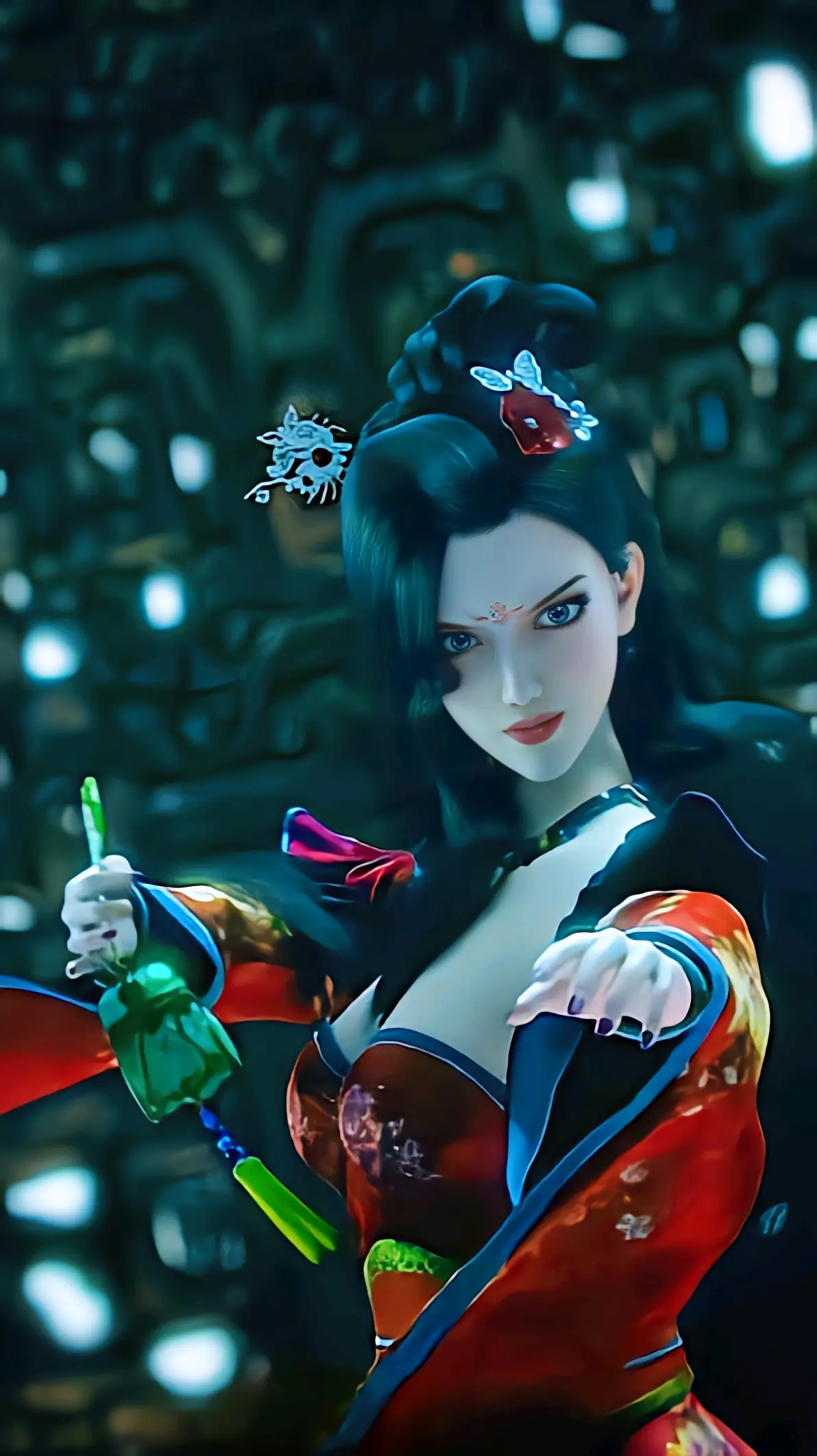 Cừu Ngự Linh khoác lên mình phục sức đỏ sẫm, môi son sắc lạnh, khí chất yêu dị khiến người đối diện vừa bị mê hoặc vừa bất an. Nàng thường tỏ ra quyến rũ, mềm mại, nhưng trong ánh mắt luôn ẩn giấu sự đa nghi và khát máu.